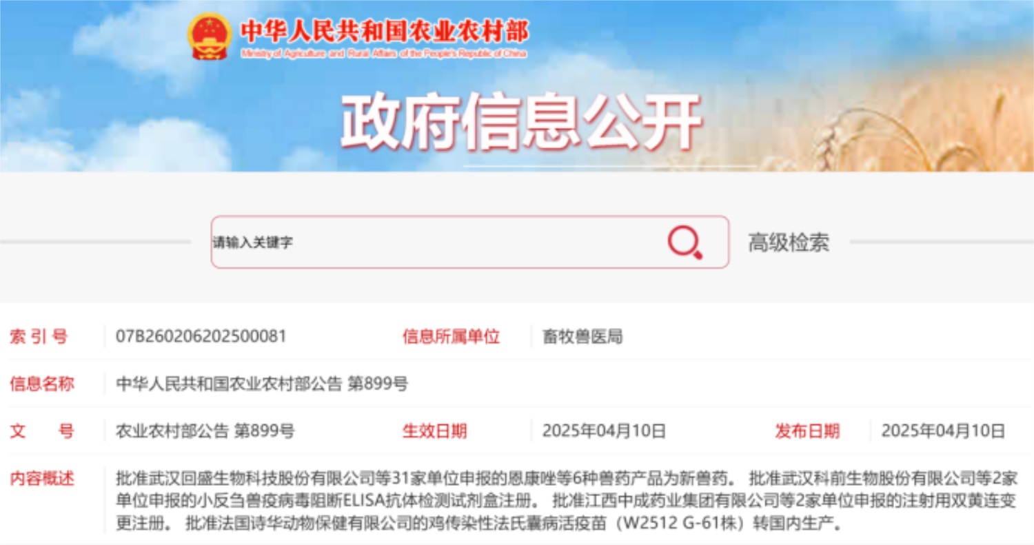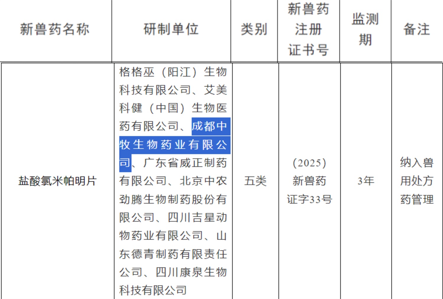 近日,農(nóng)業(yè)農(nóng)村部發(fā)布第899號公告,批準(zhǔn)成都中牧生物藥業(yè)有限公司申報的鹽酸氯米帕明片為國家五類新獸藥,核發(fā)《新獸藥注冊證書》。